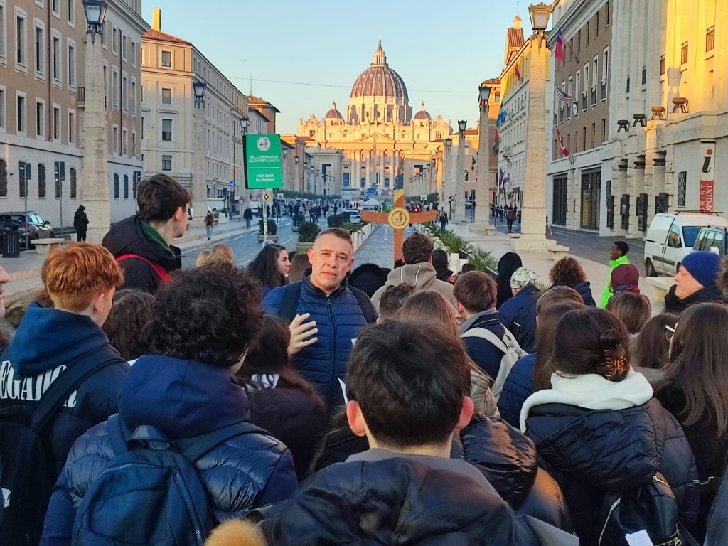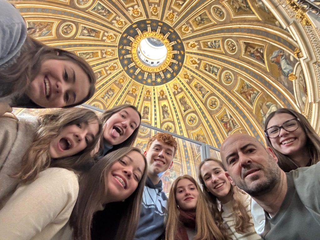 Comenzamos nuestro viaje de estudios de 2º de Bachillerato a Roma finalizando el puente de la Inmaculada de 2025. Salimos de Zaragoza el domingo por la noche y el lunes por la mañana ya estábamos en Roma disfrutando de esta fantástica ciudad un día tan especial. Dejamos las maletas en el hotel y nos dimos una buena vuelta hacia la Plaza del Popolo. No obstante, antes de llegar, hicimos parada en la Plaza de España para ver cómo el Papa rendía homenaje ante la escultura de la Inmaculada Concepción.